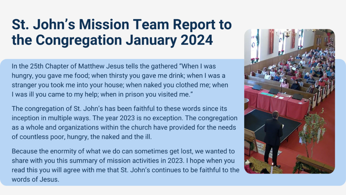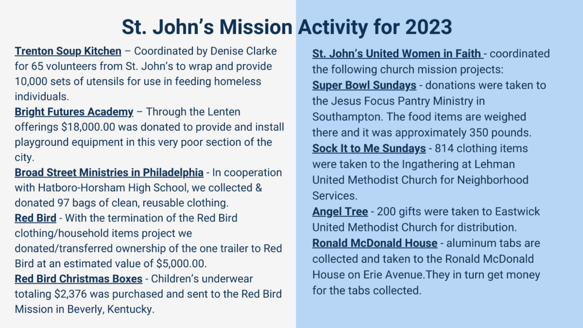 Naturally, this result is extremely difficult for the ~1250 people served on a weekly basis, and for the faithful workers who gave so much to this crucial ministry. Hearing this news burdens our hearts, as we know many vulnerable residents will need to find other resources for assistance. We will also miss the partnership and connection with fellow Christians seeking to serve God – something that Annette also noted in her letter (a copy of Annette’s letter is posted on the Missions bulletin board in the narthex). Please keep the vulnerable residents of the Eastwick community, and Annette and the workers at the Eastwick Mission House and congregation in prayer as they process – and grieve – the conclusion of this ministry.