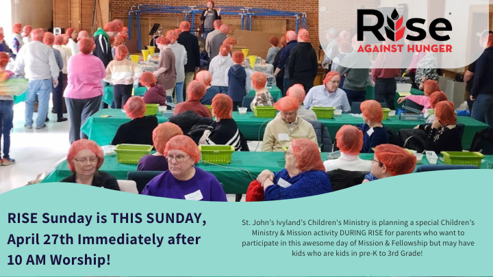 In addition to celebrating Scouts, this Sunday is RISE Sunday. RISE Sunday is an opportunity for St. John’s to live into our mission by partnering with Rise Against Hunger to provide and package meals for communities imperiled by catastrophic lack of food. The meals we will share have the power to heal, sustain and transform lives and communities. THERE IS ONE WORSHIP SERVICE AT 10AM THIS SUNDAY and this special congregational service opportunity will take place immediately after, in the Fellowship Hall.