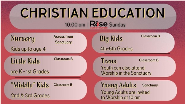 | | CHRISTIAN EDUCATION at ST. JOHN'S | | All of our Children’s & Youth Sunday School classes will meet in Classroom B at 10am. During our RISE Mission effort, parents of Children in the “Littles” and “Middles” classrooms can sign their children in for a Worship & Mission program designed to engage them while their parents participate in RISE. | | -