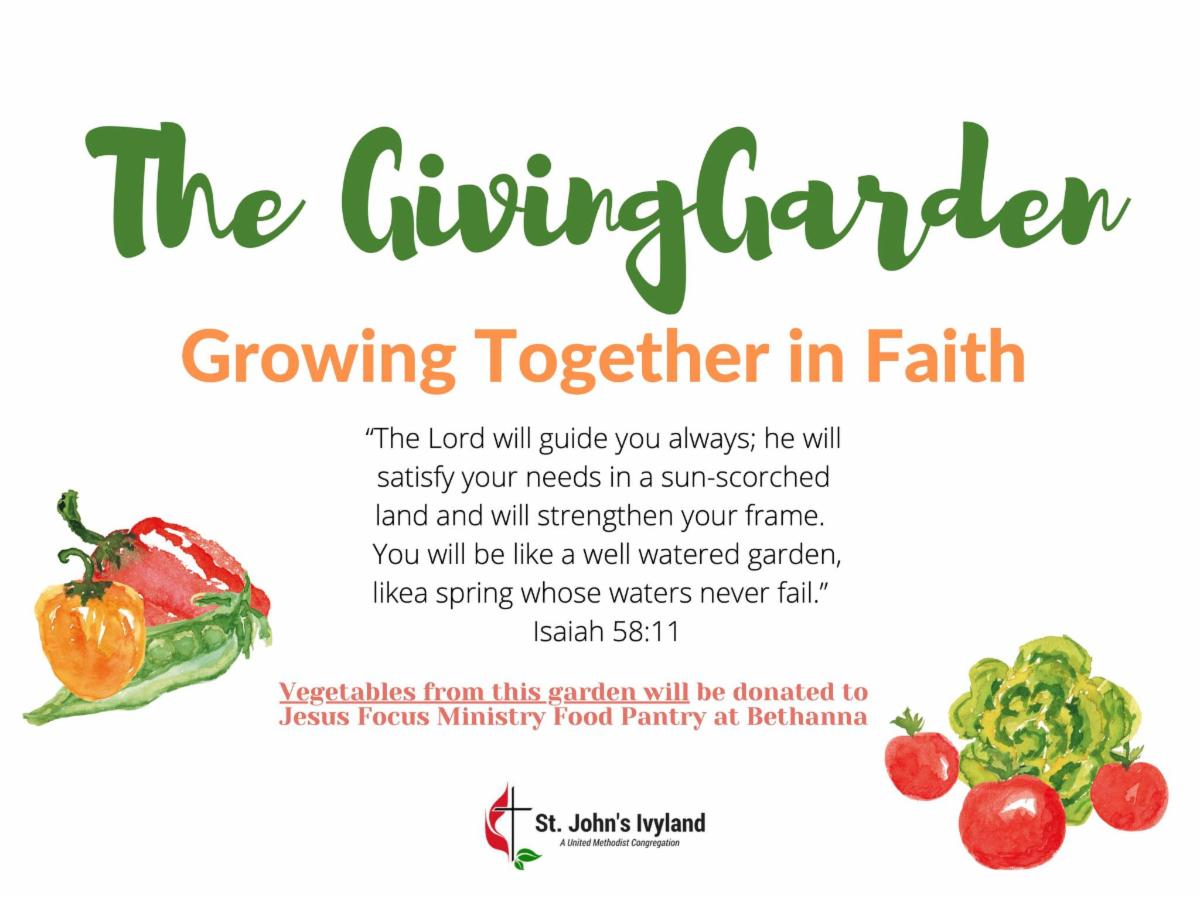 If you would like to help us maintain two vegetable gardens to benefit the Jesus Focus Ministry Food Pantry at Bethana, please contact