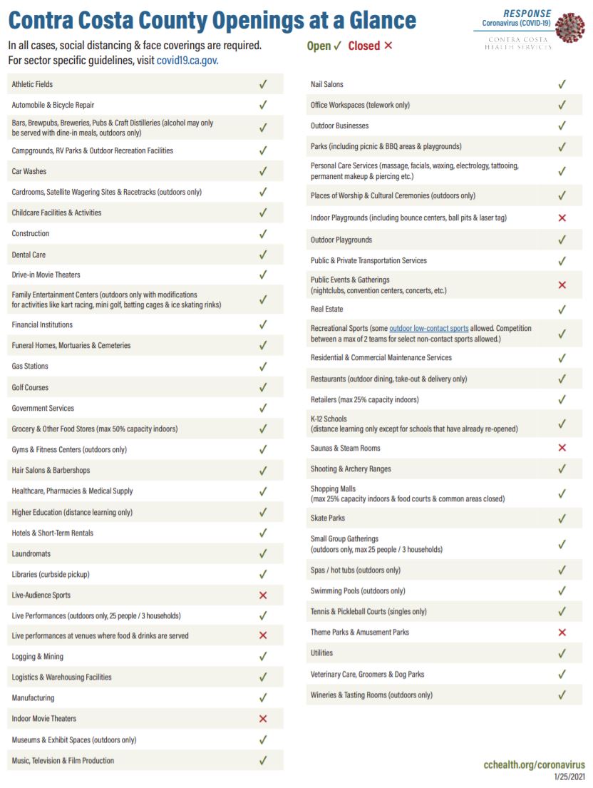 The California Department of Public Health announced today that it has lifted the regional stay-at-home order and resumed using the color-coded tier system, placing Contra Costa back in the purple tier.