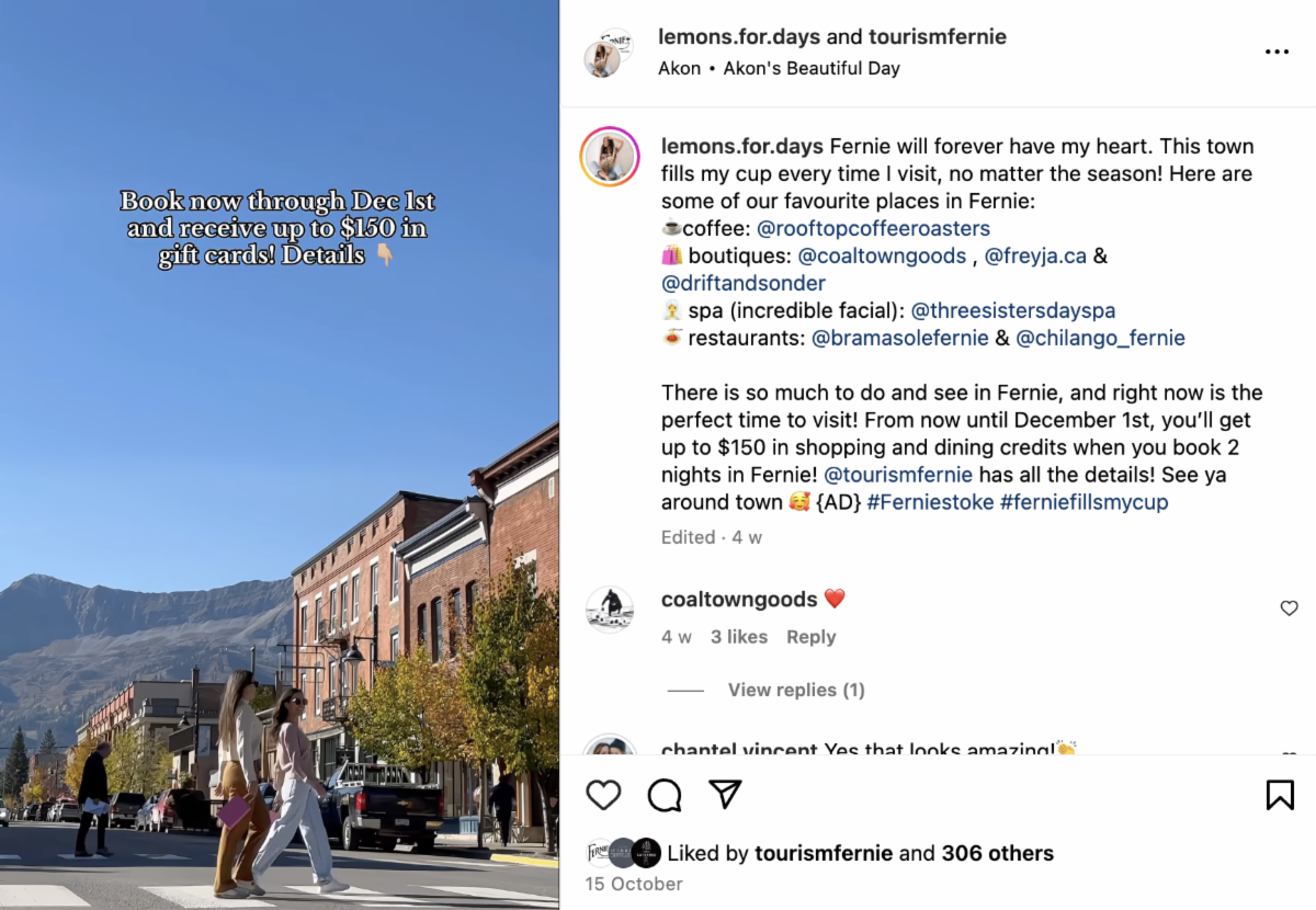 Tourism Fernie collaborated with Jasmin Shannon to produce pieces to support the 'Fernie Fills my Cup' promotion, including an Instagram Reel & Blog feature.