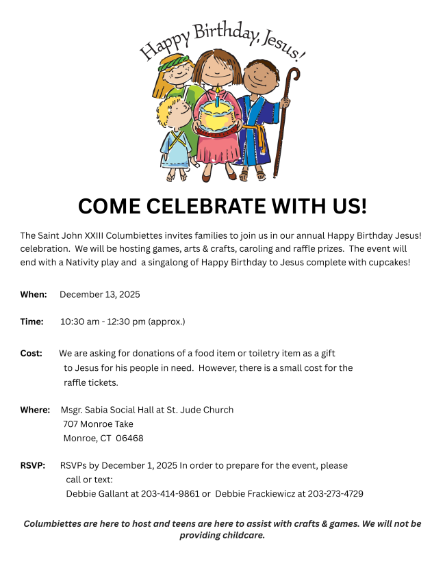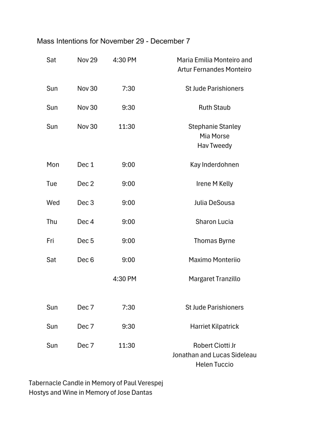 As we mentioned earlier, December 6-7 is our Welcome Home Weekend where we especially want to welcome guests and visitors to attend Mass with us. We'll have a special welcoming homily, along with pew cards with how to get back involved with the Catholic Faith, featuring resources for our Catholic Faith and an opportunity to connect with a pastoral minister of St. Jude's. Please encourage your friends and families to come and visit St. Jude's on December 6th and 7th so that they can find their spiritual home here at St. Jude's!