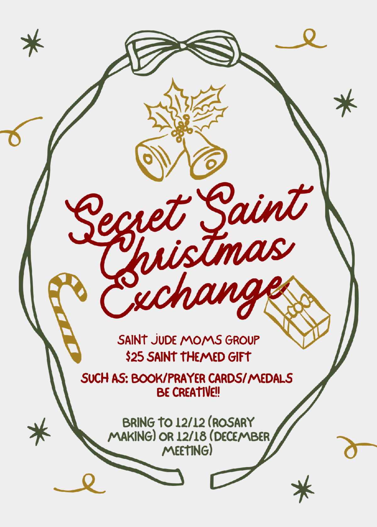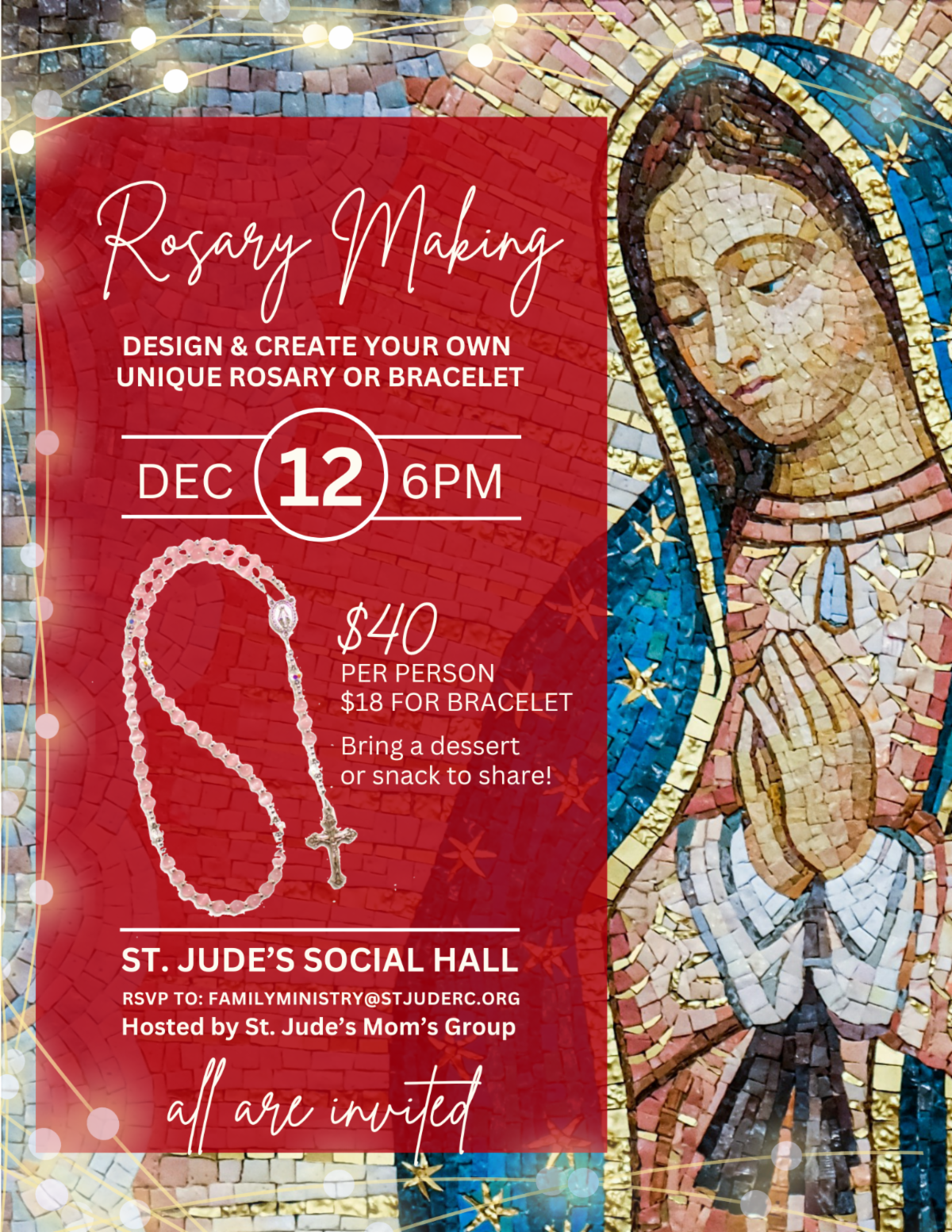 Parents are welcome to join our Parent Bible study, next Sunday we will begin an Advent bible study. All are welcome to join anytime! There is no homework or preparation required and no Bible experience is necessary. Email familyministry@stjuderc.org to join us!