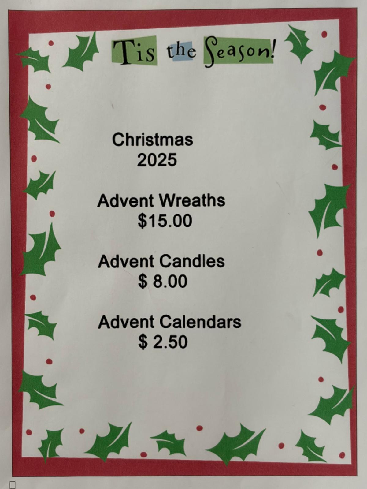 The Saint Jude Gift Shop will be selling Advent Wreaths, Advent Candles, Advent Calendars and OPLATKI Christmas Wafers (donation $2.00 each wafer). Cash or check accepted.