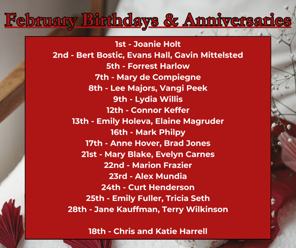 Jay Bates, Ruben Gomez, Fred Newman, “Patrick & Elizabeth Peek”, “Bonnie & Ormand Hubbard”, Helen, Betty Tull, Chas Howbert, Candice Escamilla, Ruben Aguirre, Beth Rubin, Karen Telck, Suzanne Mitchell, “Lynda and Paul Klein”, Darryl, Scott Martin, Kristin Wilkinson, "Rachelle & Dusty Taylor," and Betty Rae.