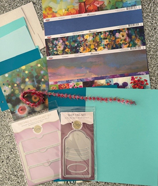 The Creative Challenge Kit for January came with two different die sets to help create slots, pockets and tags with slots plus bright and gorgeous floral papers as well as basic cardstock, ribbon and pre-cut mini-album covers and interior pages. | |