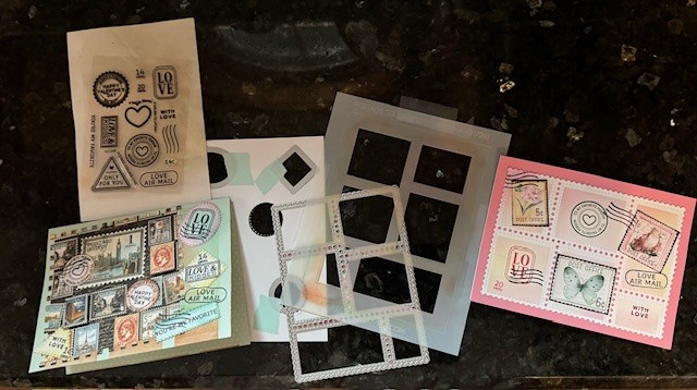 January's kit was filled with pre-cut "Postage" blank panels, a package with two different stencils for shading the panels or filling the panels with a variety of designs. The kit also included several blank A2 cards with envelopes plus a clear stamp set, plus "postage stamp" themed papers, ribbon and more!