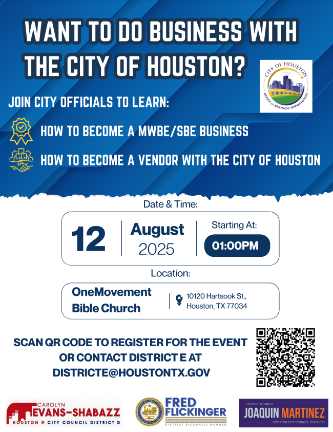 Are you a business owner looking to expand your opportunities with the City of Houston? Join us for an informative session designed to help you learn how to get certified as a Minority- and Women-Owned Business Enterprise (MWBE) or Small Business Enterprise (SME). This event will also provide valuable guidance on becoming an official City vendor. City officials will be on hand to walk you through the certification process, answer your questions, and share insights on how to successfully do business with the city.