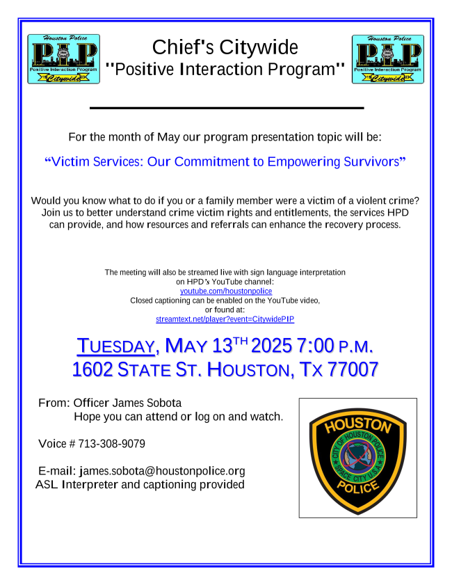 May 20 – HPD - Kingwood Positive Interaction Program (Link: PIP_Meeting.pdf)
