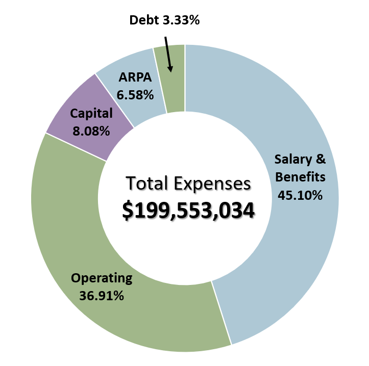 As we get closer to final approval of the county's 2024 budget, here's a look at how our funding is divided up between different spending categories. As you can see in the chart, pay and benefits for county employees make up the largest chunk of county spending at just over 45%. The proposed budget includes a 3% raise for employees and no increase in health insurance premiums. Some ARPA (American Rescue Plan Act) funding is still included in the budget but will be gone in the coming years once we've spent all $22.9 million the county received through the 2021 federal bill. The final numbers in this chart may change a little ahead of the budget's final approval, which is scheduled for the Nov. 13 county board meeting. | |