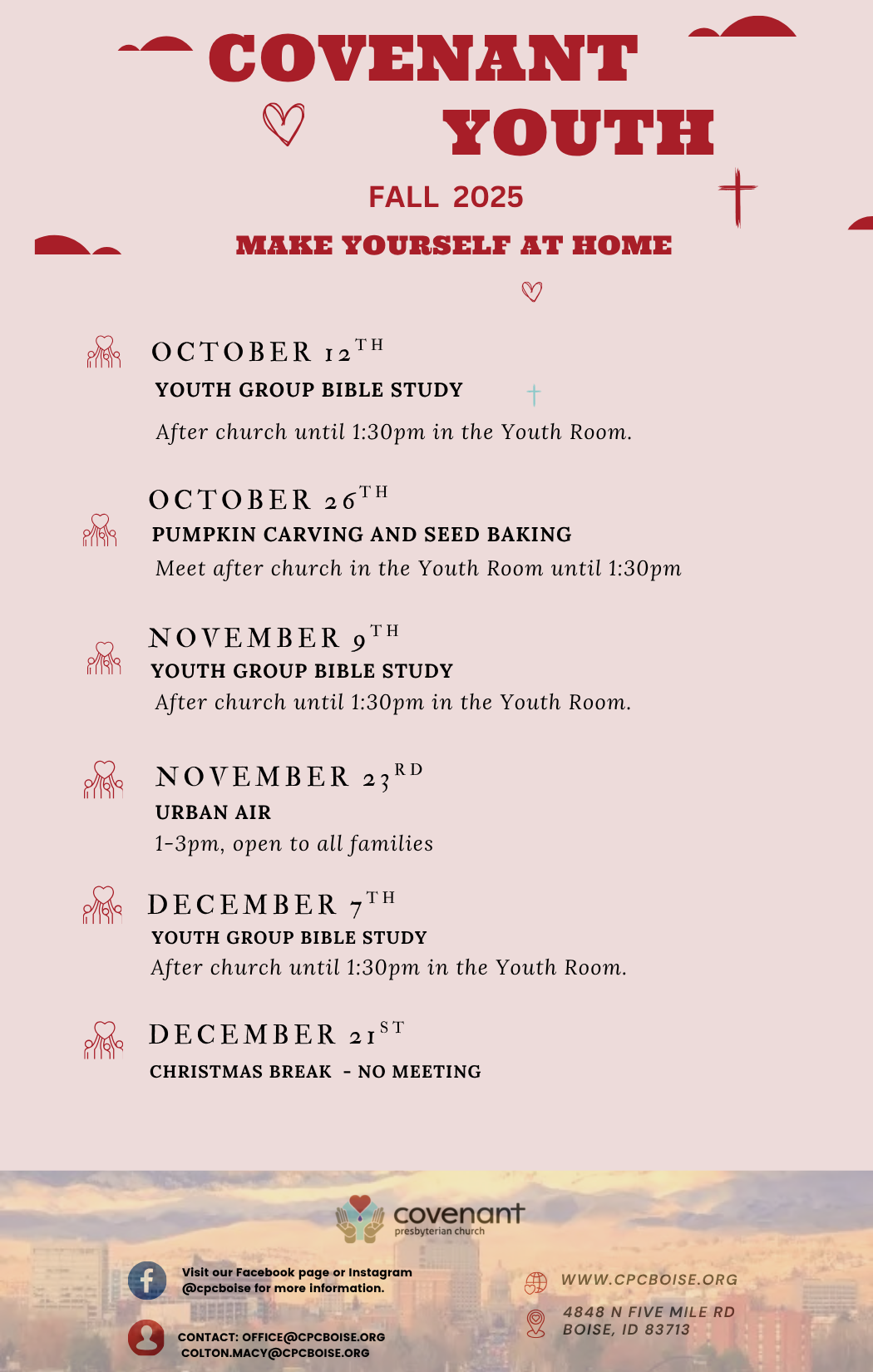 We will be studying the scripture for the upcoming Sunday morning. You can join these meetings every Wednesday at 10:00am in person or on zoom here: