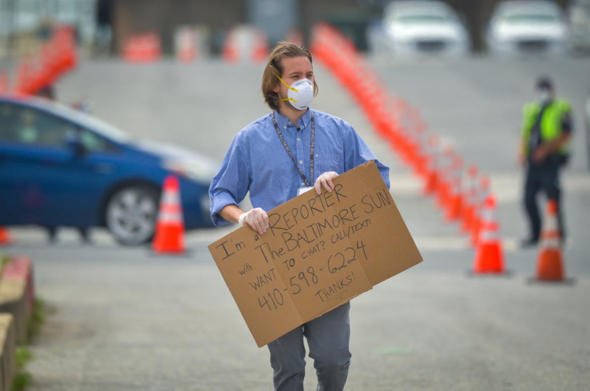 of himself at a Maryland COVID-19 testing site hefting a makeshift cardboard sign with his phone number and affiliation — an oversized calling card tailor made for social distance reporting.