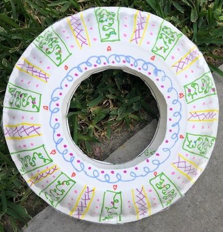 Place both plates together and cut a circle out of the middle. Separate the plates and turn both plates upside down. Decorate the plates as you wish using your colorful markers.