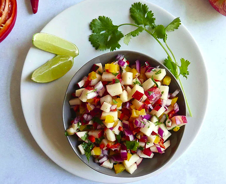 Crisp apple, pungent red onion, and sweet bell pepper come together in perfect harmony in this fall fruit salsa. Red-skinned apples such as Pink Lady, Gala, or Honeycrisp are ideal here for their sweetness, though you could also use Granny Smith for a tangier punch. This colorful salsa pairs beautifully with roasted pork tenderloin or chicken—or with tortilla chips for a fall tailgate or gathering. The lime juice keeps the apple from browning, so you can make this a day or two ahead, or hold leftovers for a few days with no worries. |