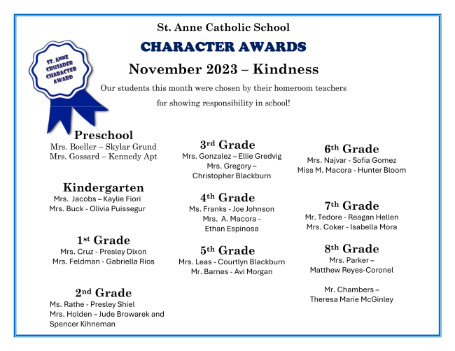 The Knights of Columbus has invited the St. Anne Students to participate in this years Keep Christ in Christmas Poster Contest. Please see the attached Entry Form for details. Posters should be submitted on 11 x 17 white paper. Posters are due to the school office by December 11.