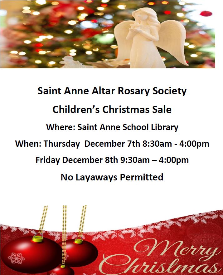 St. Anne Altar Rosary Society is so happy to be back at St. Anne School for our Children’s Christmas sale.