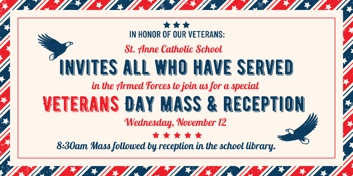 The students of St. Anne will be celebrating Veterans Day on Wednesday, November 13th, at the school Mass at 8:30 am. We would like to honor those who have served our country and helped provide for our freedom with a Veterans Day Celebration.
