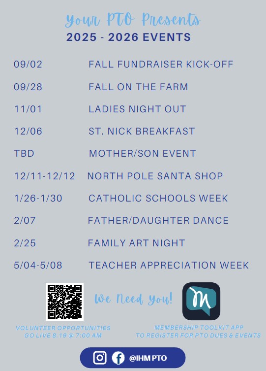 Download the Membership Toolkit App to pay for PTO dues, access a directory of IHM families, and pay for events quickly and securely. Volunteer opportunities are now open for sign ups here! Help is needed for weekday, evening, & weekend events!