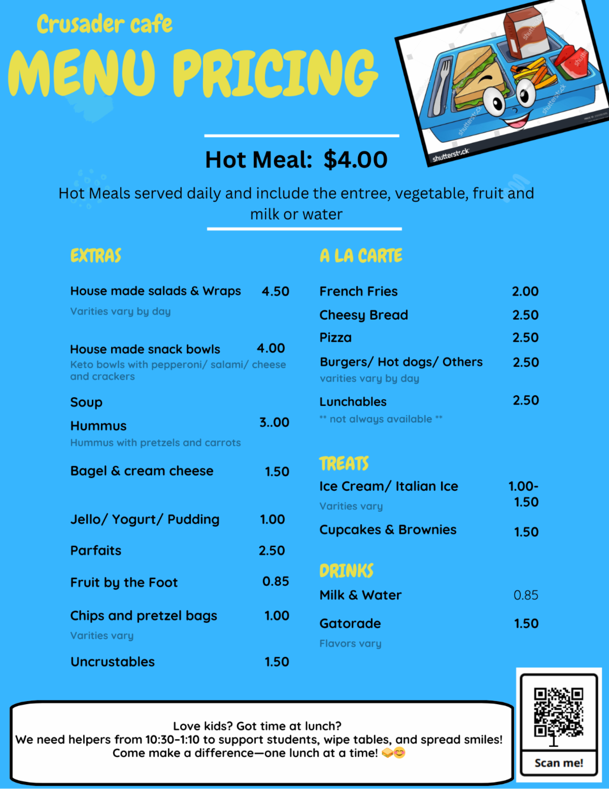 Welcome Back Crusaders! The Cafe Crew has been hard at work getting it all ready to go for you. Please see the attached flier for some reminders about adding money to your account and reviewing the menu. You can add money to your MySchool Bucks Account. Pricing is below.