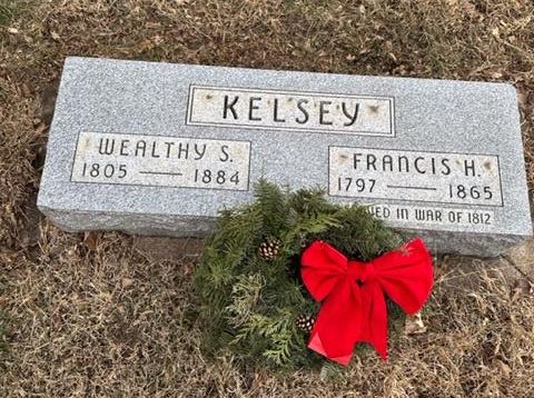 It was a miserably cold and rainy Saturday in 2023, but the volunteers turned out in force for the Ceremony and Wreath laying at Evergreen. The spirit of the day was inspiring. We waited until all the wreaths had been laid there and received almost a dozen that were available. We drove over to White Cemetery and had our own informal wreath laying. We had first chosen a gravesite from one veteran of each of the seven wars that are represented in our cemetery with a couple of wreaths left over for the gates. There was one obvious first choice, Francis Kelsey, veteran of the War of 1812.