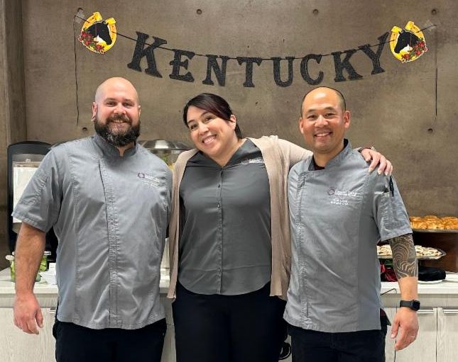 | | | | Almost as popular as the Walking Taco, and just as “West Coast,” is Spam Musubi (grilled Spam and rice wrapped in nori), a Japanese/Hawaiian fusion treat “finally making it to the mainland,” says Culinary Development Director Peter Klein. At Cathedral Catholic, when it has appeared at the Food Truck, it sells to the tune of 150 servings. Like many other trendy items, it is also making its way around Tik Tok. Click here to see more. | | The Kentucky Derby at Francis Parker School | | | | If school-age children would not quite be drawn to a Kentucky Derby–themed brunch menu, certainly faculty and staff attending a “professional workday” (non-instructional, that is), would. That’s what Belinda Lopez, regional director of operations at Francis Parker School, had in mind when tasked with providing a breakfast meal in a new and unique manner. | | Lopez credits the collective experience she and her management team at Parker have, which includes many years working in hotel catering and staging brunches, in providing the inspiration for the event. This includes Executive Chef Daniel Luong and Chef Manager Colten Lemmer. “For me,” Lopez says, “this was the special part—all three of us working together. It’s nice working with a leadership team that all want the same thing: to create the best dining experience. And, who doesn’t like a brunch?” | | By all accounts, the customers certainly did on the morning of May 2, the day before Sovereignty pulled away from Journalism at Churchill Downs to win the 151st Kentucky Derby. In developing the brunch menu, Lopez and Luong identified some popular brunch items, “and nothing screams ‘brunch’ like Eggs Benedict,” she notes. They then put a southern/Derby twist on items where they could, such as the Bourbon-glazed ham. No Derby-themed event would be complete without the famed Mint Julep, which appeared in a mocktail version as Mint Julep Mimosa, along with a Mock Spicy Bloody Mary. | | left to right: Lemmer, Lopez, Luong | | |