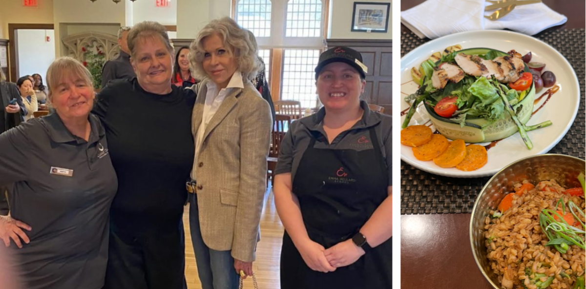Click here to nominate an exceptional team member for future inclusion in this space, on Nudge, and on the intranet. | | Click here to Share Your Story—inspirational or just plain fun stories about your associates, team, clients, and, of course, great food! | | Visit @CulinArtCareers on Instagram for boots-on-the-ground stories of real team members in the field. | | FOND MEMORIES: Actress, activist, fitness guru, and Emma Willard School graduate Jane Fonda (second from right) took a moment to meet CulinArt dining services associates (from left: Anita Briggs, Pam Gordon, Jessica Herrara) during her recent visit to campus to receive the school’s first-ever Global Changemaker Award. Fonda graduated from Emma in 1955 and returns regularly to address students and other campus groups. Late last month, her visit also included a lunch comprising a Grilled Apple Salad with Honey Thyme Chicken served with Farro Stir Fry. | | Wheeler rolls out sushi in support of school trips | When a Wheeler School teacher wanted to treat students to sushi, she could have called up to a dozen or restaurants in downtown Providence (says Yelp). She needed to look no further, though, than the school’s dining services team, which was able to bring in Rob DeReamer, district chef, to meet her needs. | | | Amy Bonnici, who teaches Spanish and coordinates “global experiences” (class trips), requested the food in anticipation of a student trip to Japan this month. She regularly conducts social gatherings to build students’ enthusiasm for the upcoming trip and makes sure to blend food into the experience. For this purpose, Chef Rob and Becky Bernier, sous chef, made a salmon roll, shrimp roll, and veggie roll, along with Japanese Fried Rice, for about 35 students and chaperones. | | | | |