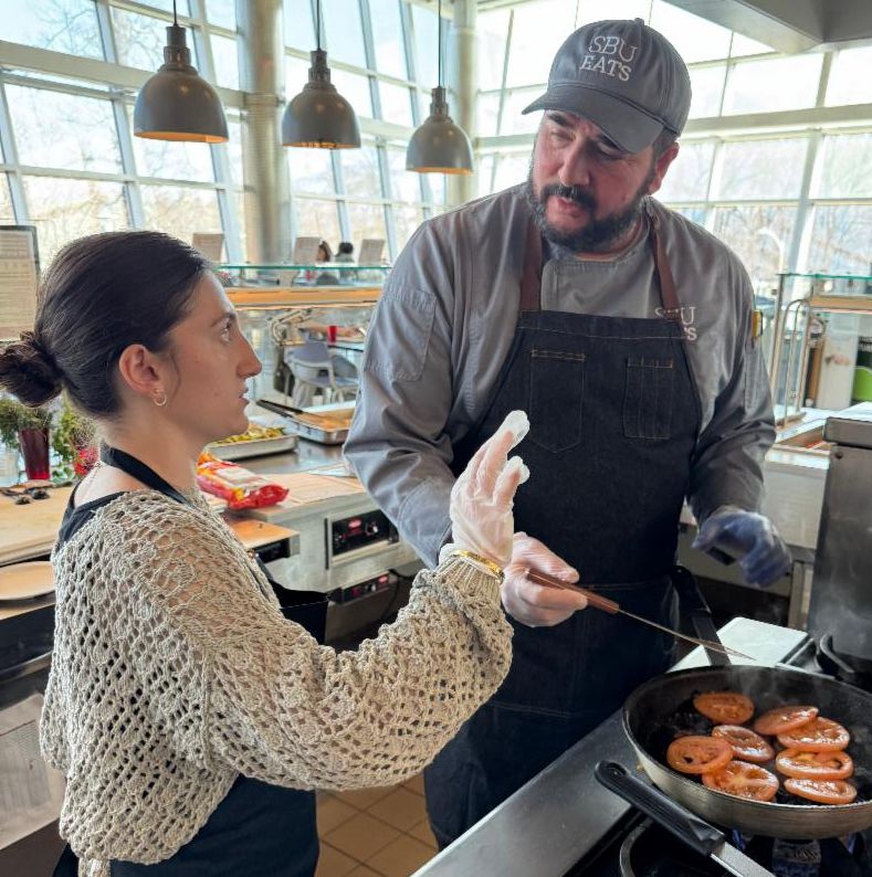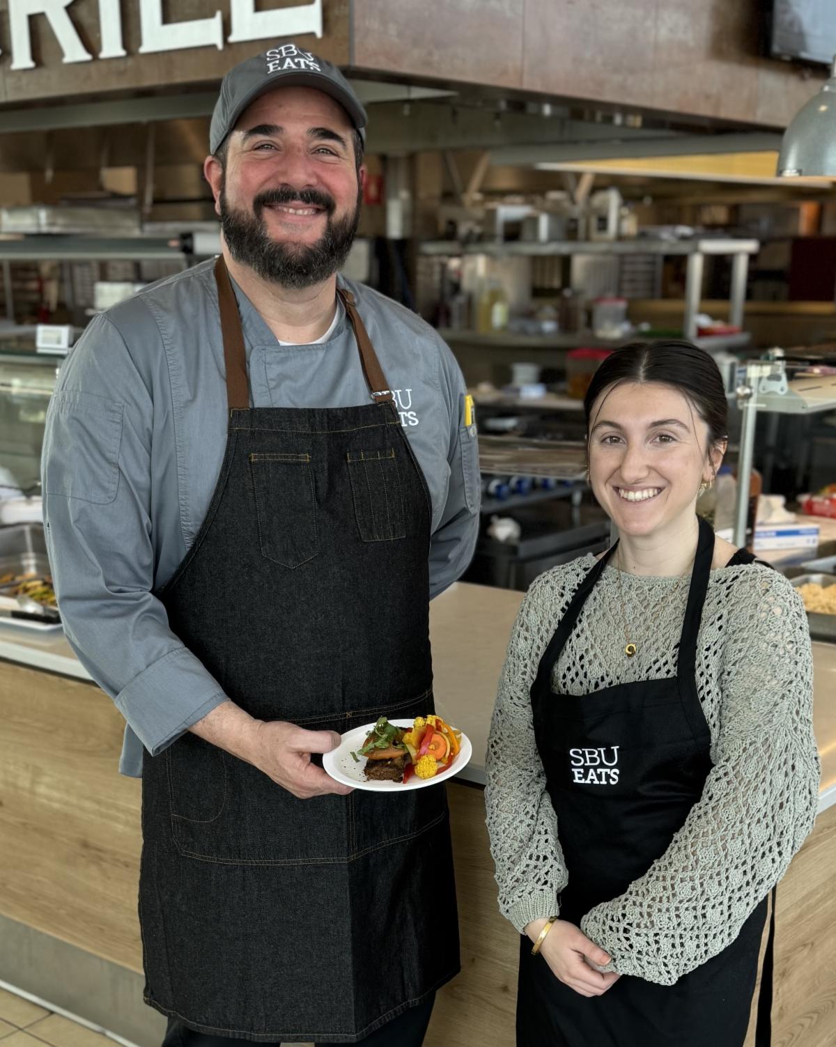 | | | Stony Brook student Lilly Resciniti worked with Joseph Rosselli, executive chef for SBU Eats, on Kebab Tabei, which, unlike common kebabs, is made with a spiced ground-meat mixture and is cooked in a pan or skillet, not grilled or with skewers. | | A world away, home comes to Stony Brook | Stony Brook University’s “Cooking from Home” program, introduced to CulinArt’s largest account in the fall 2023 semester, “was developed to bring cultures celebrated on campus, right to the forefront of our kitchens,” says Will Sheehan, marketing manager for SBU Eats. “It also is a way to build more of a community by having students become a “chef for the day.” | Part of the program’s development stemmed at the outset from international students saying they miss the foods and flavors they grew up on in their home countries. Cooking from Home endeavors to give some of that loss back to them and has done so for students from as far away as Zimbabwe and Peru. | | |