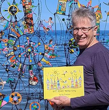 Photo: Artist James Patterson with his book Saturday Morning and sculpture, The Storytelling Machine.