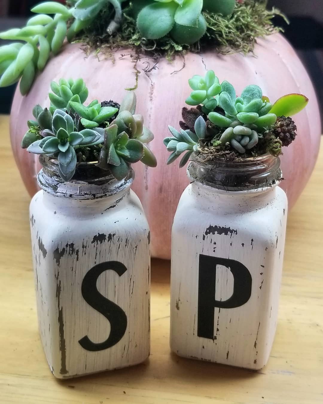 Sweet Salt and Pepper Shakers look great with this Terra Cotta pumpkin! 3 sets coming to the EFM this Saturday!! Plus lots of succulent filled pumpkins!