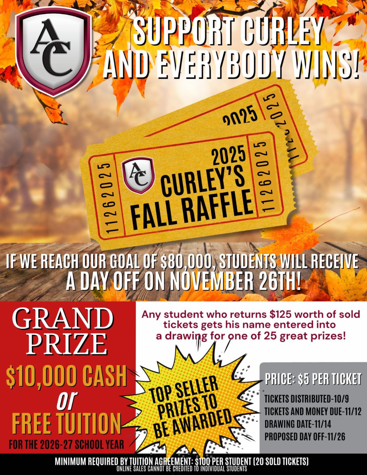 Students received their Fall Raffle ticket packets on October 1, 2025, from their faculty advisors. The raffle winner will have their choice of free tuition for the 2026-27 school year or $10,000 cash. All sold tickets are due back by November 12, 2025, and families are reminded that per the tuition agreement, each student is required to return a minimum of $100 worth of sold tickets (or be charged $200 on their tuition). This raffle benefits every Curley family as money raised goes directly toward the school's operating budget. There will be "Top Seller" prizes and any student returning $150 worth of sold tickets will have his name entered into a drawing for 25 Visa gift cards. If we reach our $80,000 goal, students will have November 26th (the day before Thanksgiving) off from school. Additional tickets can be picked up from the Advancement Office at any time during school hours. Thank you in advance for your support of this important Curley fundraiser! Please e-mail Barry Stitz at bstitz@archbishopcurley.org with any questions.