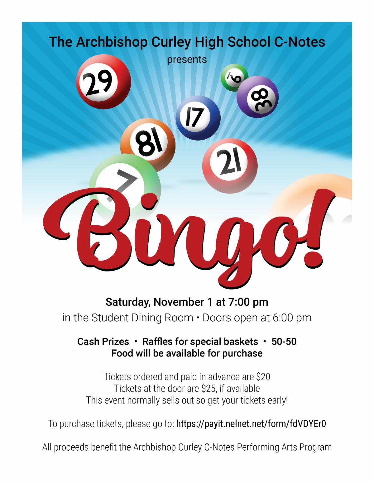 The C-Notes will hold their annual Bingo on Saturday, November 1, 2025. This event helps fund Archbishop Curley's band, choir and theater programs, and we need your help to make it a success! Get your tickets HERE!