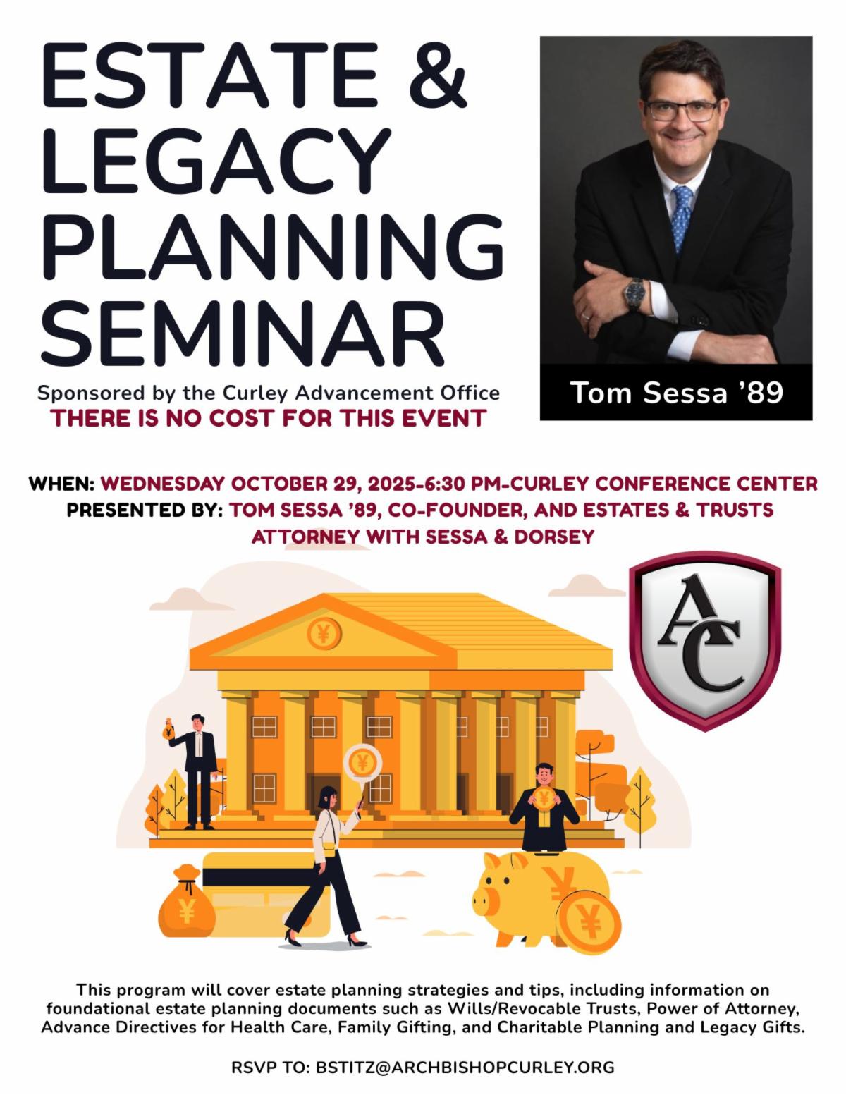 Plan Today, Impact Tomorrow -- FREE SEMINAR! On Wednesday, October 29, 2025, at 6:30 pm in the Curley Conference Center, we are excited to welcome Tom Sessa ’89 back to Curley to share his expertise as an Estate & Legacy Planner. Tom will discuss practical ways to protect your family’s future, and build a lasting legacy that reflects your values.
