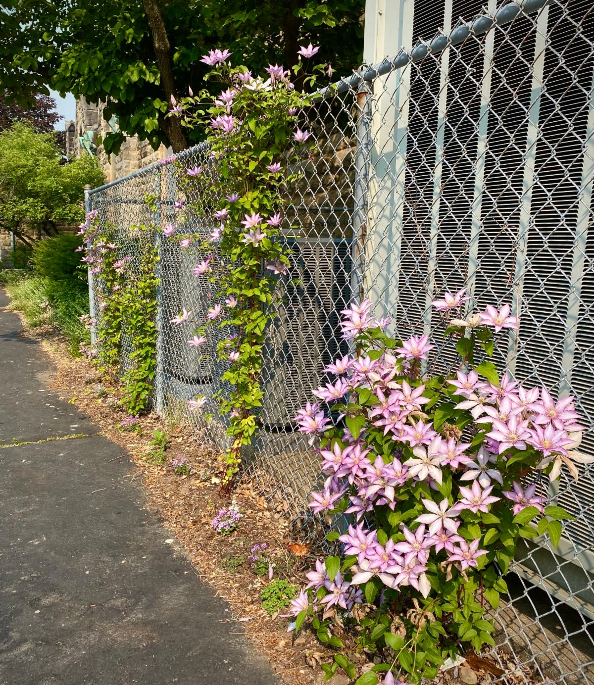I'm particularly fond of the clematis that we planted along the fence by the massive AC units. Each year these plants get bigger and more full, and one day--God willing--they will largely obscure the necessary but unsightly AC condensers.