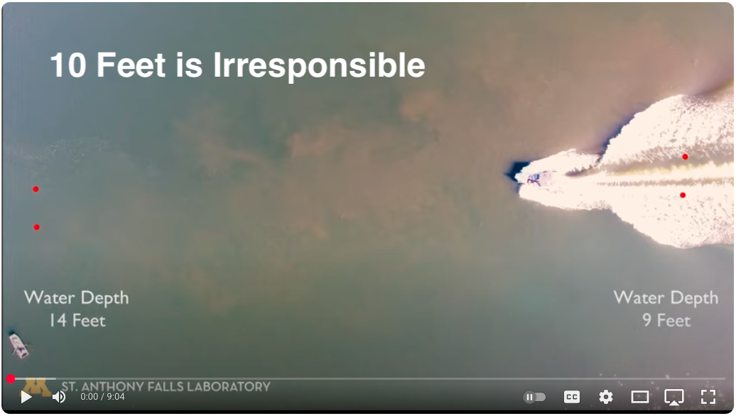 The newest wake research from the U of MN says that wake sports in water less than 20 feet deep can cause enormous damage to aquatic ecosystems (see news article on Phase 2 above). At the same time, the watersports industry would have you believe that engaging in wake sports in water as shallow as 10 ft constitutes responsible boating.