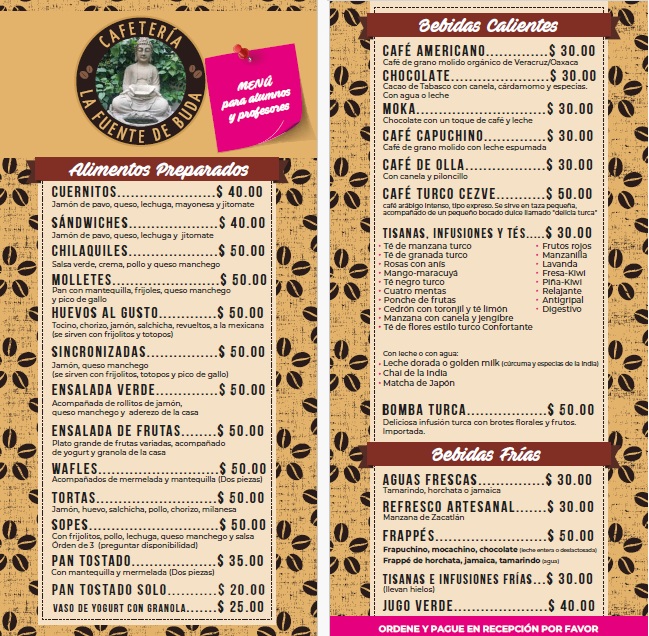 Durante los cursos se dan 30 minutos de receso. Contamos con cafetería en el jardín, para su comodidad y agradable estancia (adjuntamos el menú).