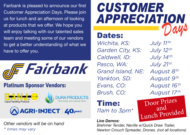 Visit your favorite Fairbank location in the coming weeks for our Customer Appreciation Days. See dates in the picture above or download the attachment. We look forward to seeing you soon!