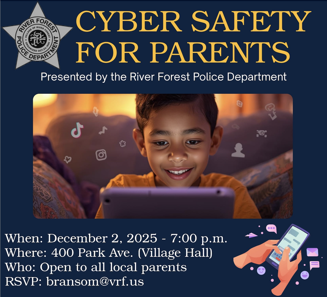 Join the Police Department for an important community seminar to help children stay safe online. This session will take place Tuesday, December 2 at 7 p.m. at Village Hall. Discussion topics will include the benefits and risks of AI, how to recognize child exploitation tactics, strategies for addressing cyberbullying, privacy settings and parental controls, local case studies from the community, and much more.