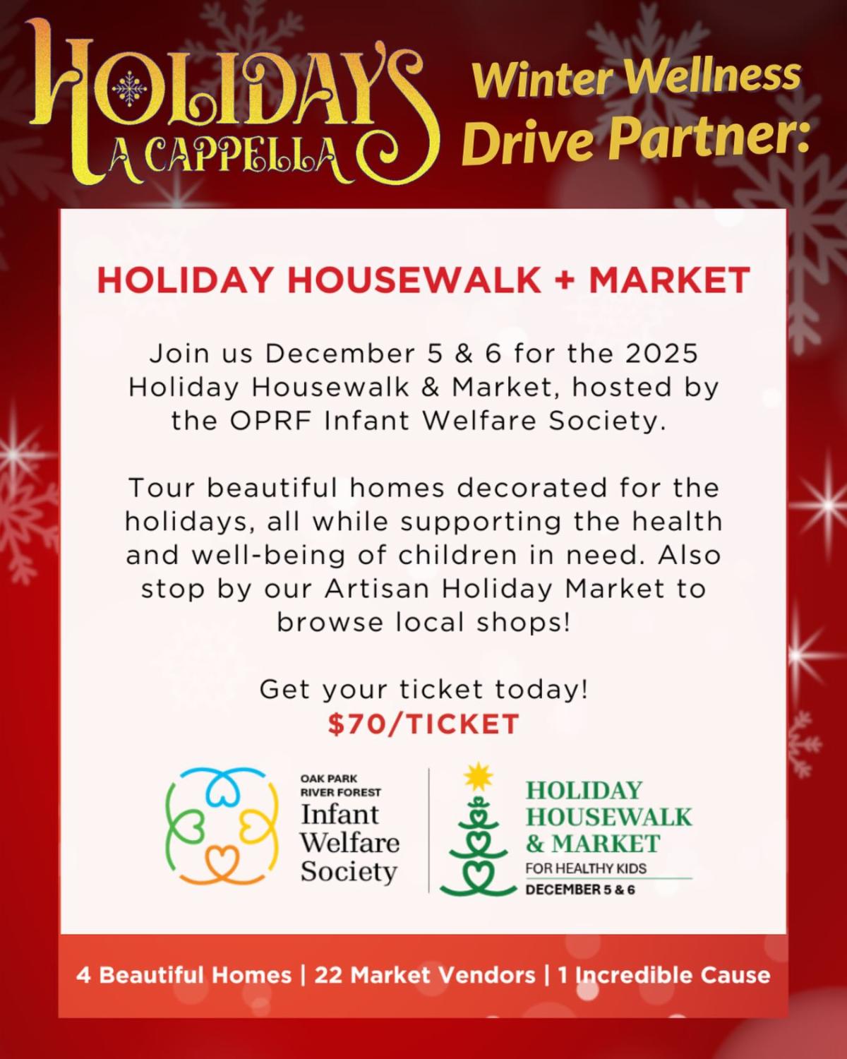 Kick off the holiday season at the Oak Park River Forest Infant Welfare Society’s (IWS) Holiday Housewalk and Holiday Market Friday, December 5 and Saturday, December 6! Tickets are on sale now to tour four beautifully decorated homes in Oak Park and River Forest with festive décor, creative tablescapes, and floral designs created by local professionals. All proceeds benefit the IWS Children’s Clinic, which provides medical, dental, and behavioral health care to children in need across Chicagoland. Learn more here.