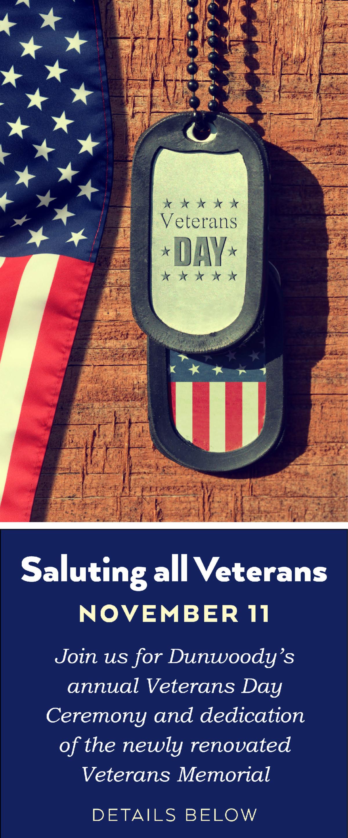The City of Dunwoody will commemorate Veterans Day with a special ceremony and the dedication of the city’s new Veterans Memorial at Brook Run Park. The event will take place on Tuesday, Nov. 11, at 10 a.m., at 4770 N. Peachtree Rd. All are welcome.