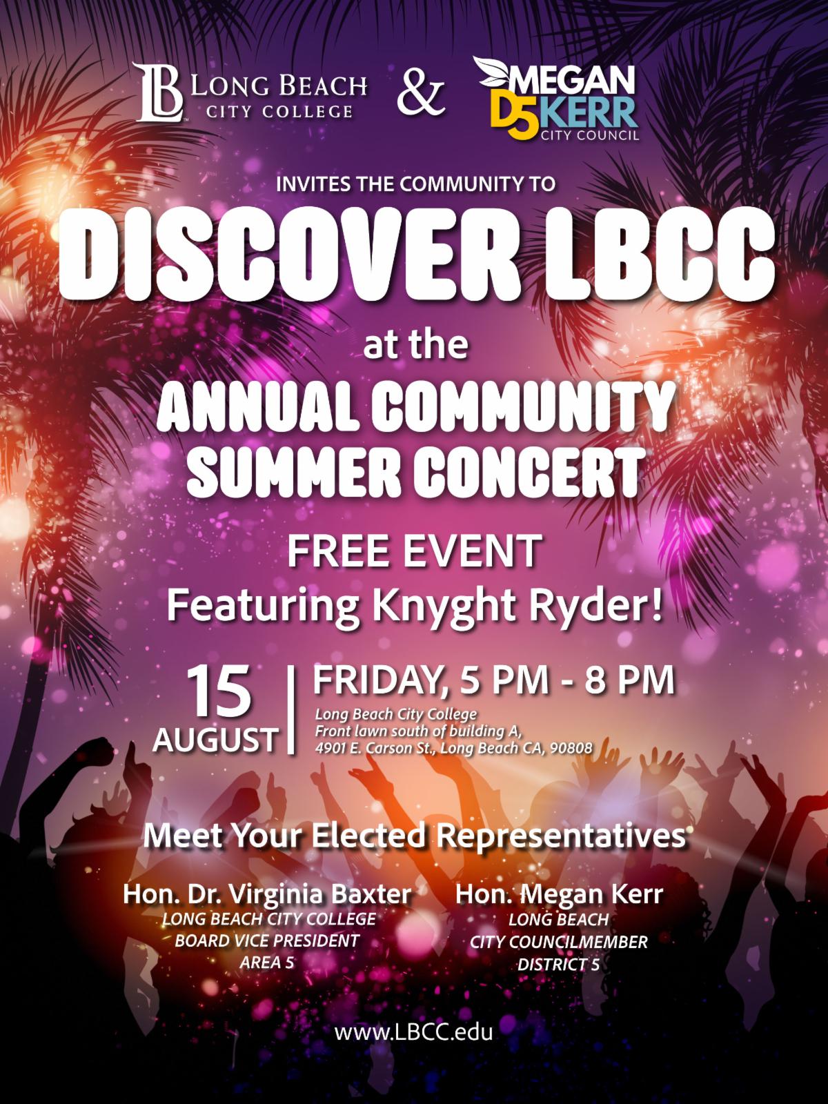 For the 3rd year in a row, my office has partnered with Long Beach City College to bring you the free Discover LBCC Summer Concert this August! Spend the evening enjoying the beautiful LBCC campus with neighbors, featuring food trucks, a beer garden, and the musical stylings of Knight Ryder!