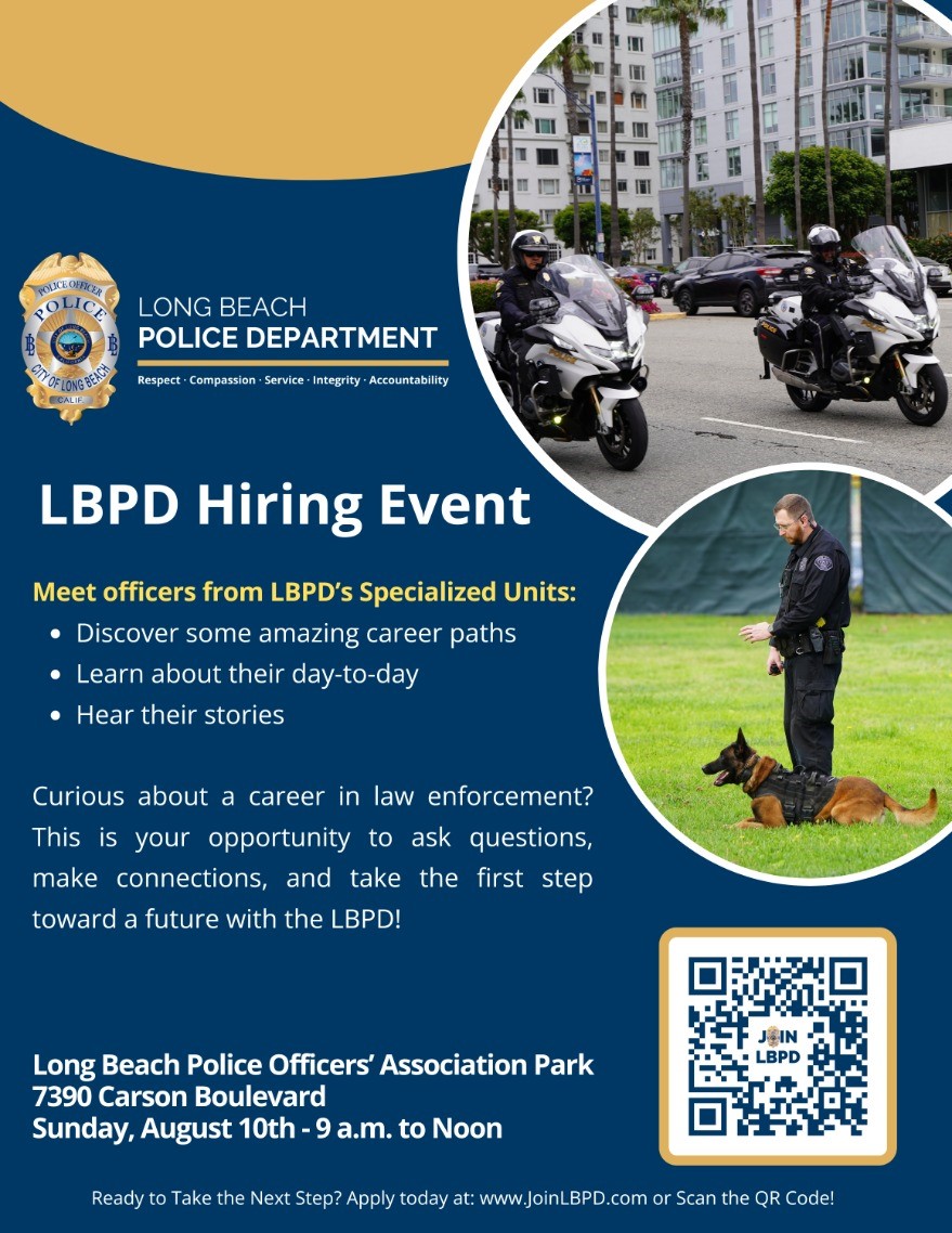 Do you know anyone who may be curious about a career in law enforcement? Have them attend LBPD's upcoming Hiring Event. This serves as a great opportunity to ask questions, make connections, and take a the first step toward a future with the LBPD.