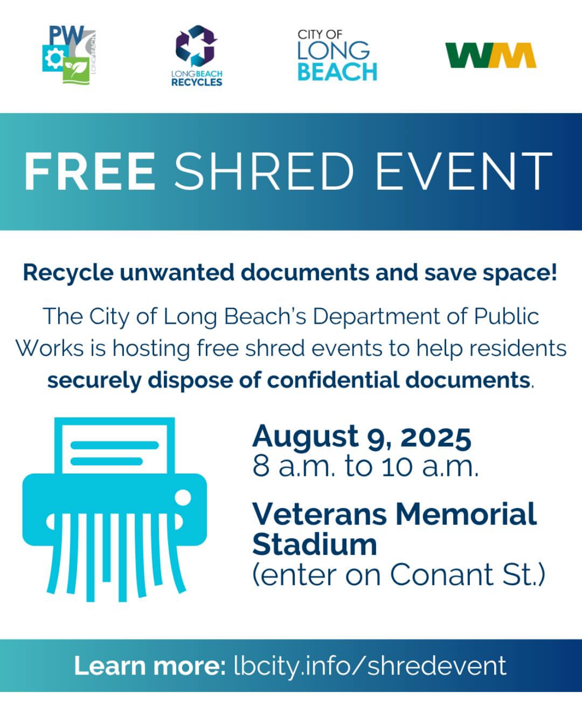 The City of Long Beach Environmental Services Bureau is hosting a free shred event this Saturday, August 9am from 8am - 10am at Veterans Memorial Stadium, 4901 E. Conant St., (enter on Conant St.), to help residents securely dispose of confidential documents. The event is open to Long Beach residents only.