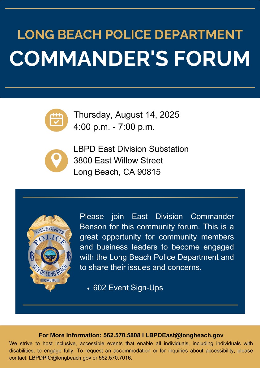 Join neighbors and East Division Commander Benson for her upcoming Commander's forum. This is a great opportunity for community members and business leaders to become engaged with the Long Beach Police Department and to share their issues and concerns.