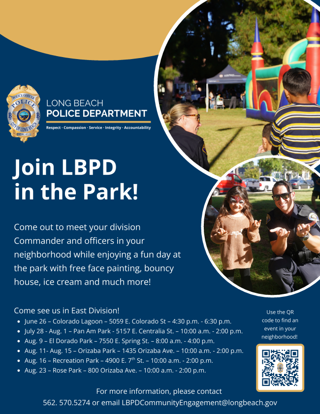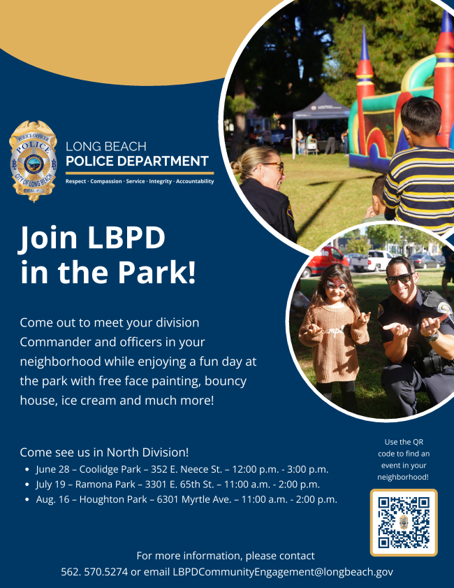 Join the LBPD's summer Park Activations! Park Activations are family friendly events hosted at Long Beach Parks designed to strengthen relationships between members of the community and the Long Beach Police Department. Join LBPD in the Park at one of these upcoming events, where you can meet your local Commander and officers in your neighborhood while enjoying a fun, family-friendly day at the park! Visit longbeach.gov/police/events to find upcoming events with North & East Divisions in and near CD5.