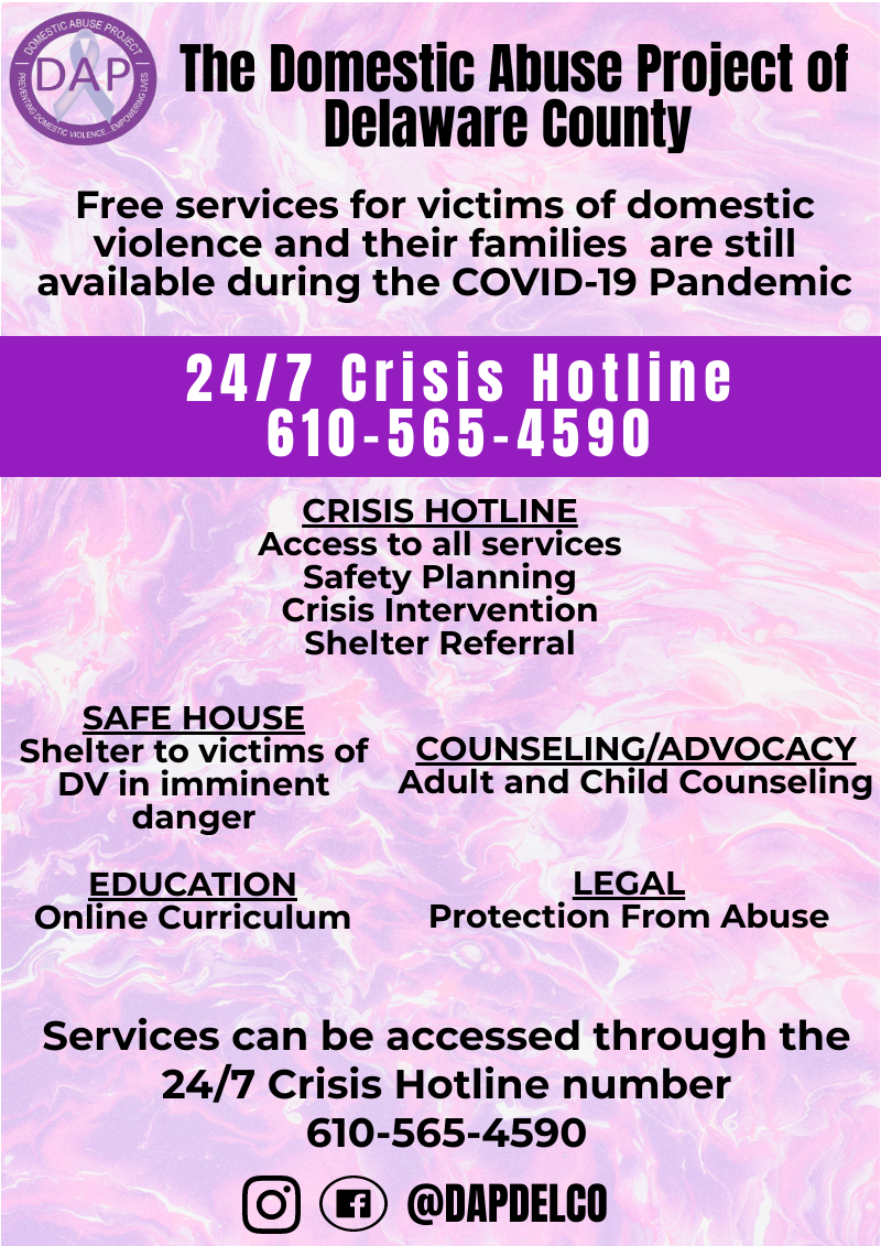 DAP’s Chester City advocate is available by phone to any resident of Chester City seeking support or legal options. DAP's Criminal Court advocate is available by phone for any client with questions about their criminal hearing.