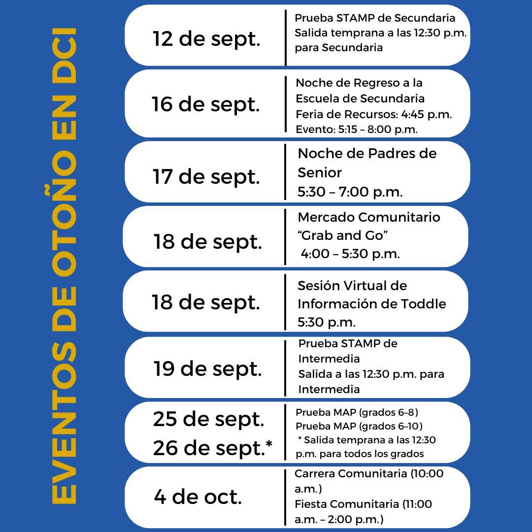 El primer Mercado Comunitario Grab and Go se llevará a cabo el jueves 18 de septiembre de 4:00 a 5:30 p.m. en la cafetería principal, a la que se puede ingresar por la 14ª y Aspen. ¡Tendremos alimentos enlatados, fruta fresca, arroz, frijoles y más, todo gratis! Para más información, comuníquese con el Enlace de Participación Familiar de DCI, Brian Garcia, en brian.garcia@dcinternationalschool.org.