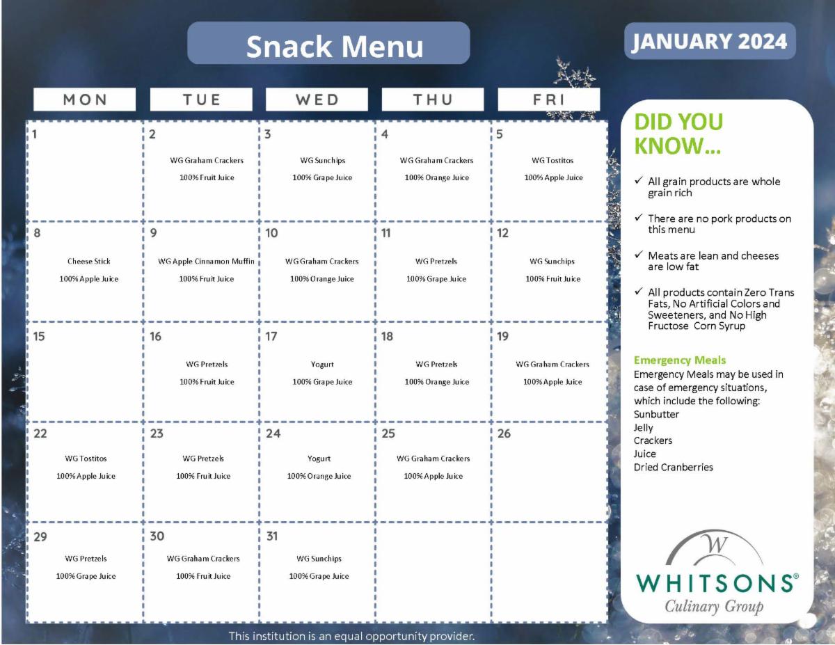 Snack Menu for Aston, CTE, Madison, CTR, and Sharon Hill | |