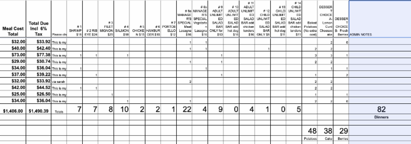 Fast forward to 2019. Now, thanks to the willingness of the members to use our new online sign up system, the managers need not do any of those time consuming steps which left much room for human error . . . now they simply click on a link anytime they want to see the entire picture. The butcher, treasurer, and accountant also click the link anytime they want to see the data - automatically tallied and ready for analysis and billing. Imagine the countless hours that may have been wasted on a task that could be automated. Now the managers can concentrate on what they do best - creating delicious meals and ensuring great member service.