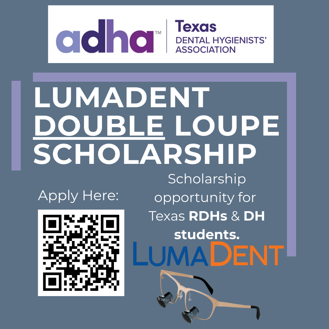 The Texas Dental Hygienists’ Association’s IDEA Committee is proud to partner with LumaDent to present a Loupe Scholarship for two 2.5x Galilean TTL loupes to a deserving dental hygiene student and practicing dental hygienist. This scholarship will award one student and one dental a hygienist a pair of custom-fitted LumaDent loupes supporting their clinical success and professional growth.